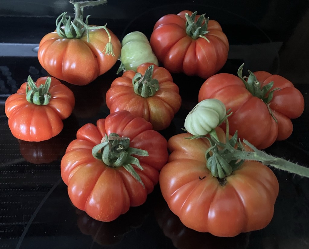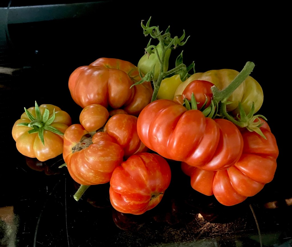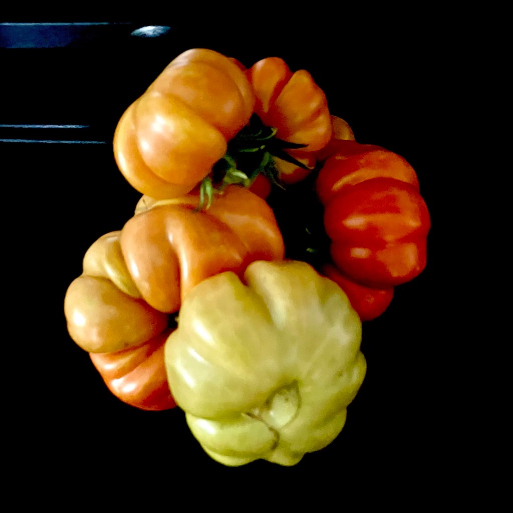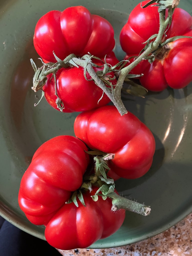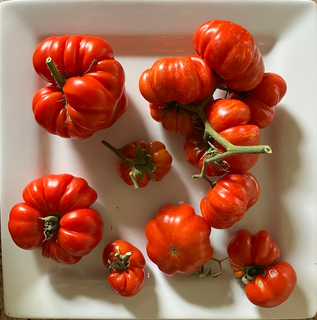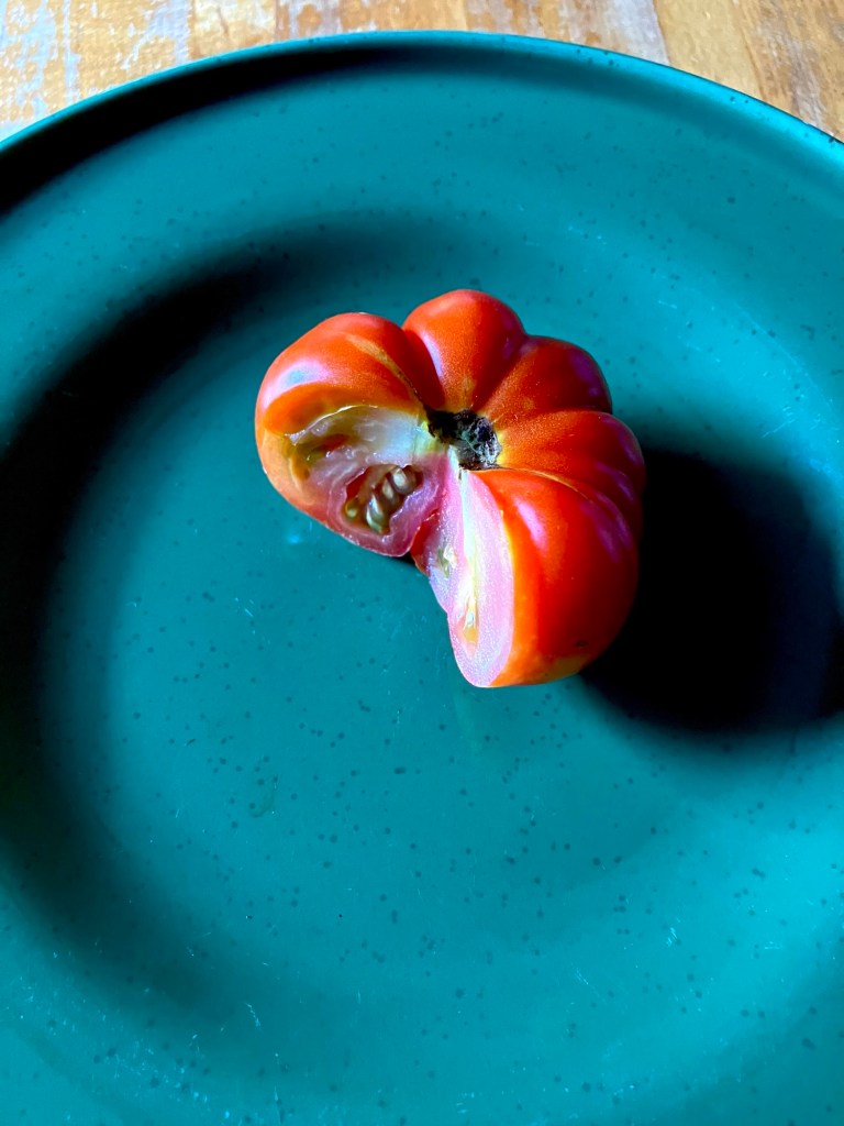 I love how the ribs of these tomatoes are so much like citrus segments. Damaged segments can be cut out & the rest saved, and there is virtually no core.“… twin flowers or fasciation of flowers. This happens when two flower buds develop within the same sepals, potentially leading to two conjoined tomatoes. “