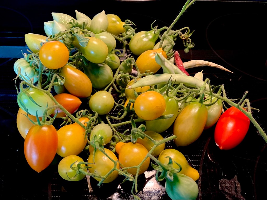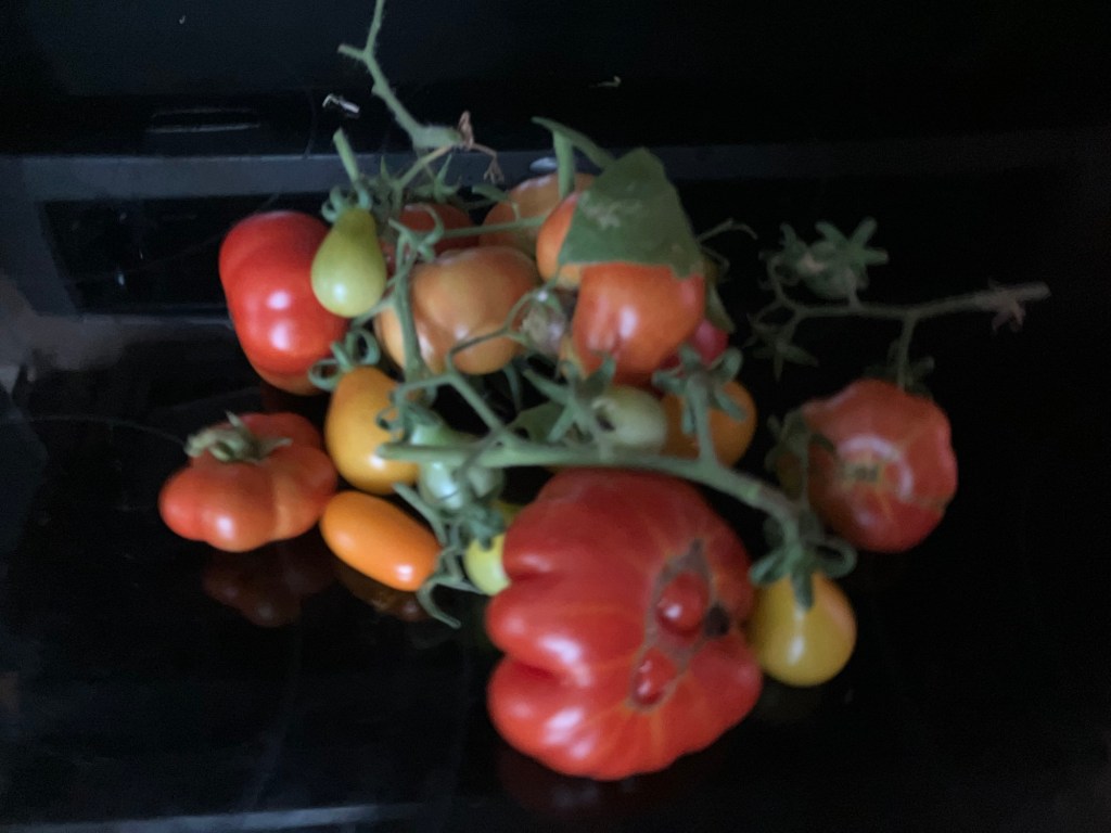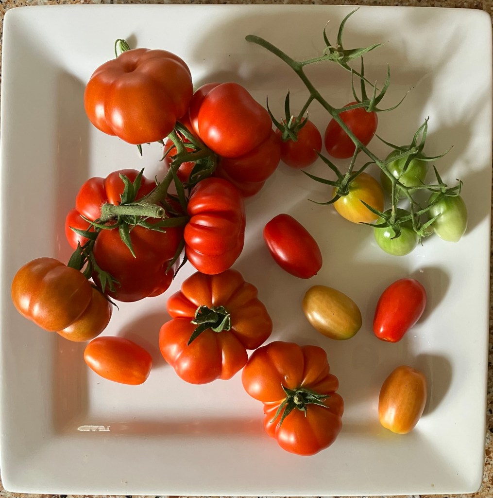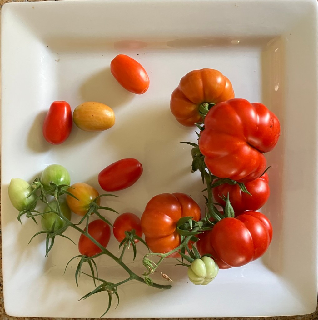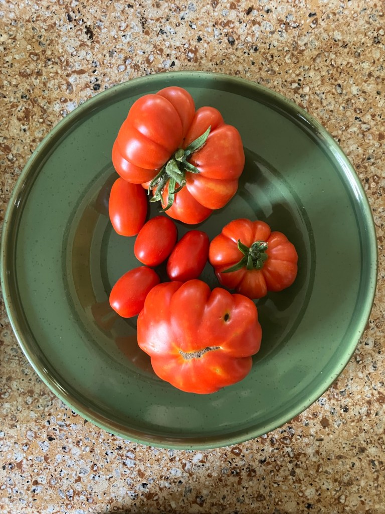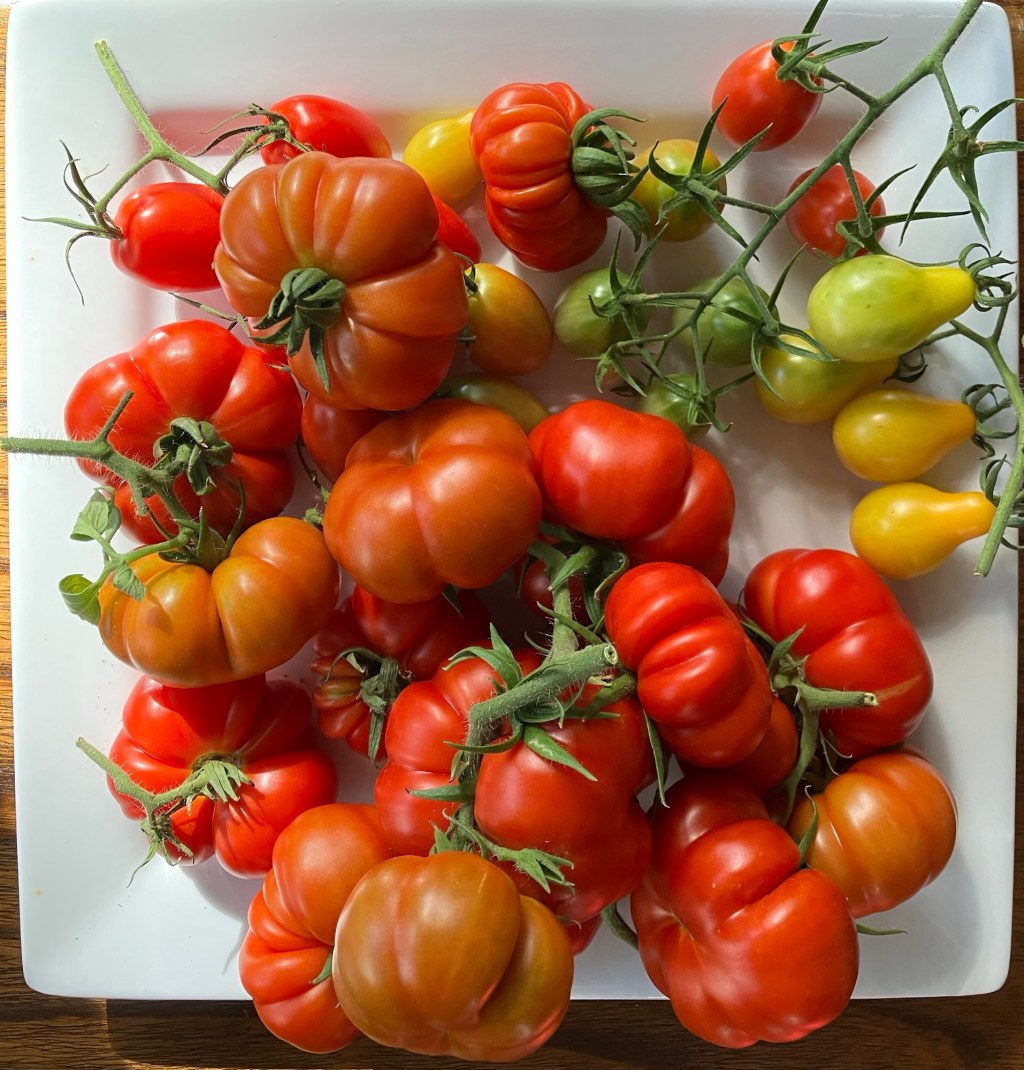 I love how the ribs of these tomatoes are so much like citrus segments. Damaged segments can be cut out & the rest saved, and there is virtually no core.“… twin flowers or fasciation of flowers. This happens when two flower buds develop within the same sepals, potentially leading to two conjoined tomatoes. “
