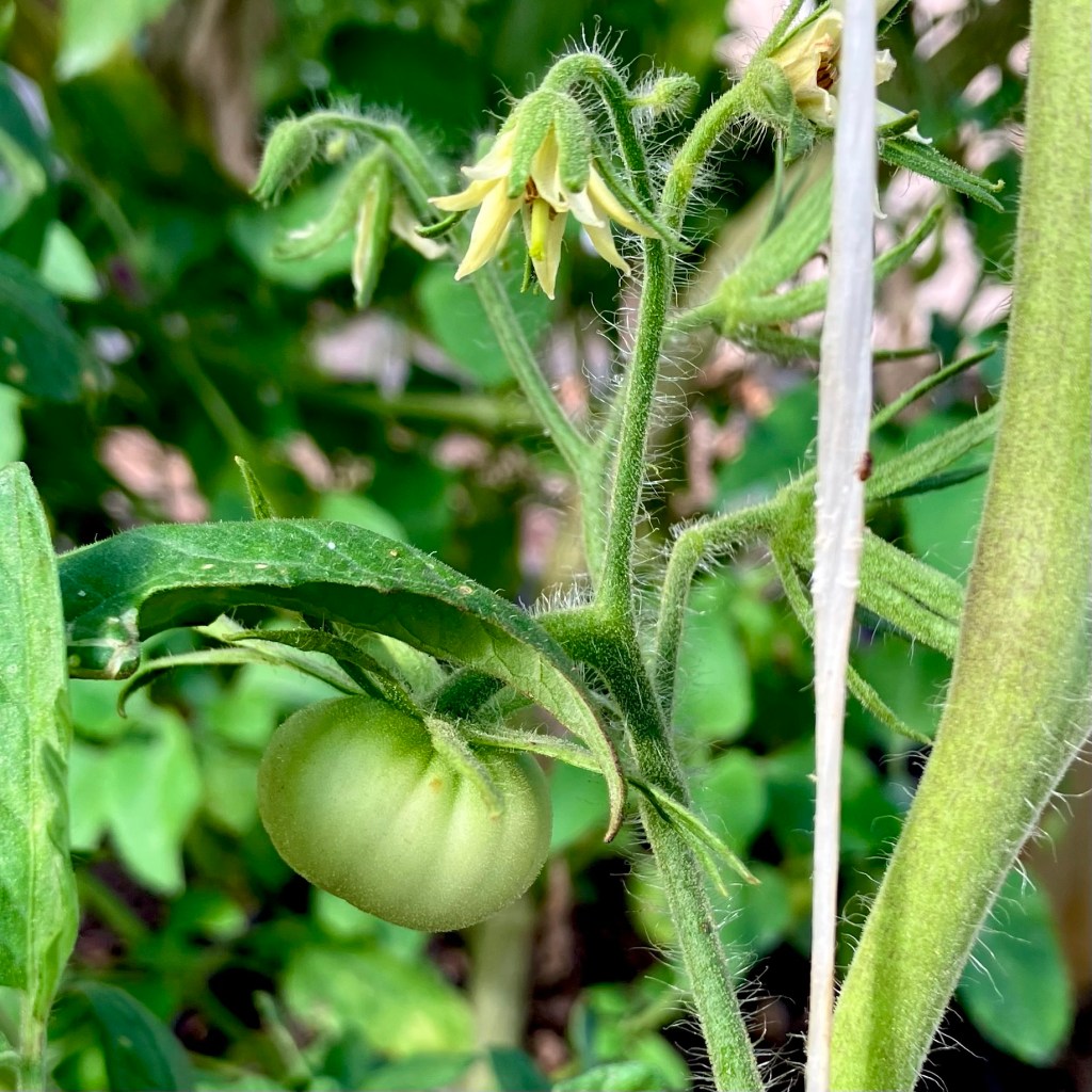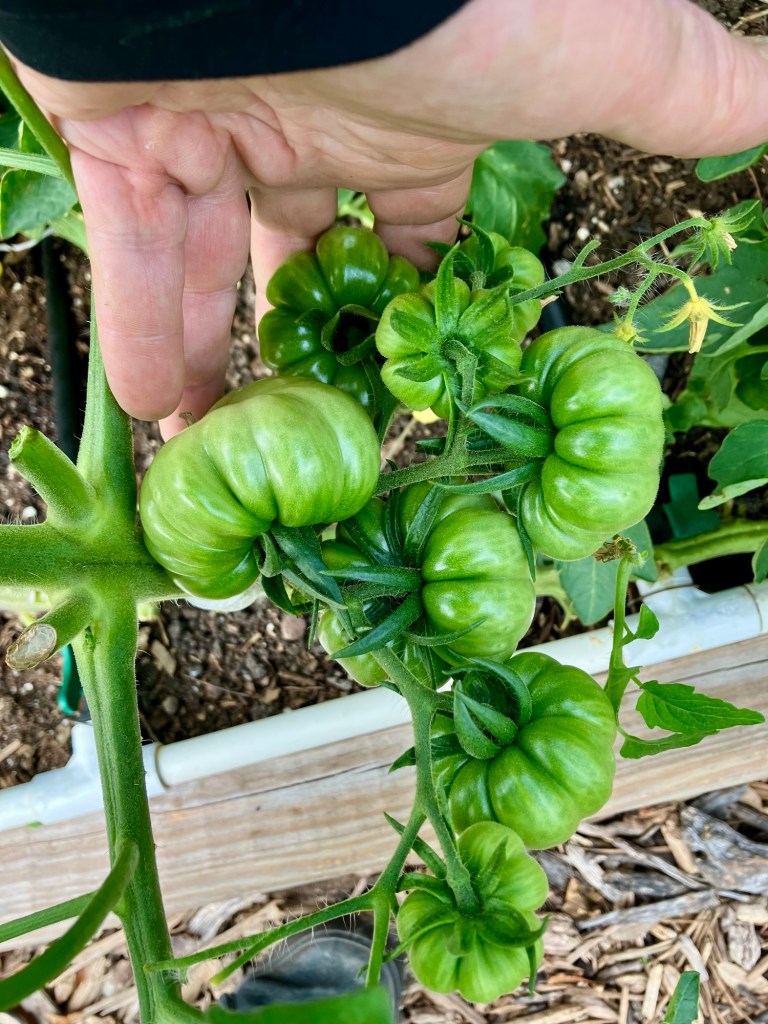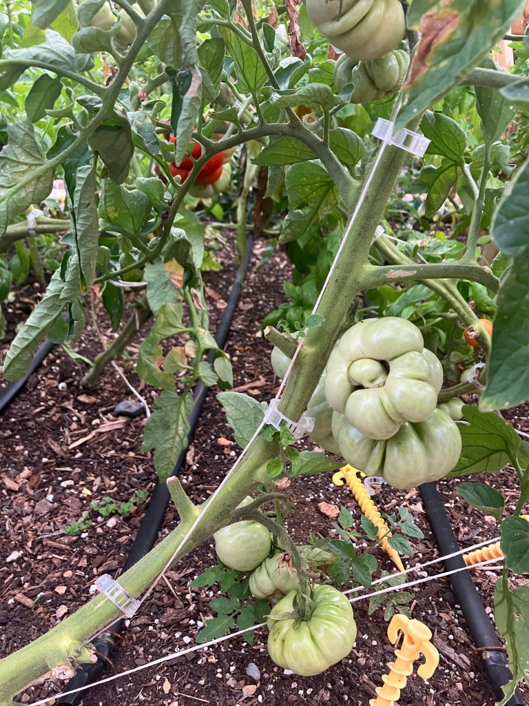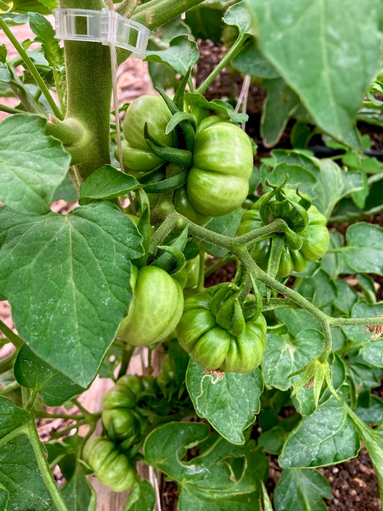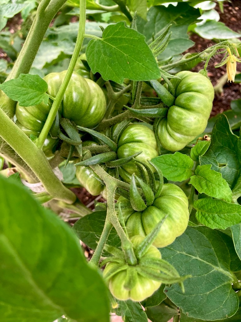 Vines have grown 10 – 12 feet in length. About 1/2 of the length is trailing on the ground & 1/2 is being kept in easy reach and is beginning to produce fruit. Each plant is currently trained to have 2 to 3 developing ’suckers’ in addition to the main apex, or terminal bud, of a plant’s main stem.